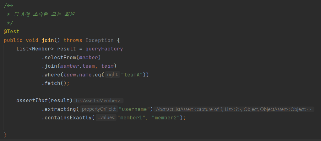 조인의 기본 문법은 첫 번째 파라미터에 조인 대상을 지정하고, 두 번째 파라미터에 별칭(alias)으로 사용할 Q 타입을 지정하면 된다.