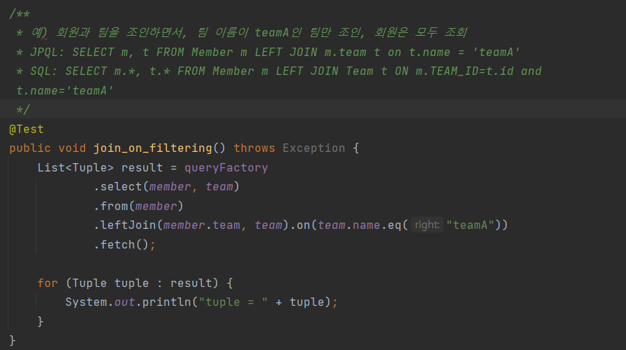 ex) 회원과 팀을 조인하면서, 팀 이름이 teamA인 팀만 조인, 회원은 모두 조회