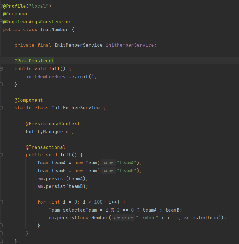 기존 jpa 정리 때도 사용했던 로직이다. 우선 Profile을 local 로 등록하여 test 가 실행될 때는 실행되지 않도록 하였고, PostConstruct 를 하용하여 의존성 주입이 이러는 후에 실행되는 로직을 작성하였다,