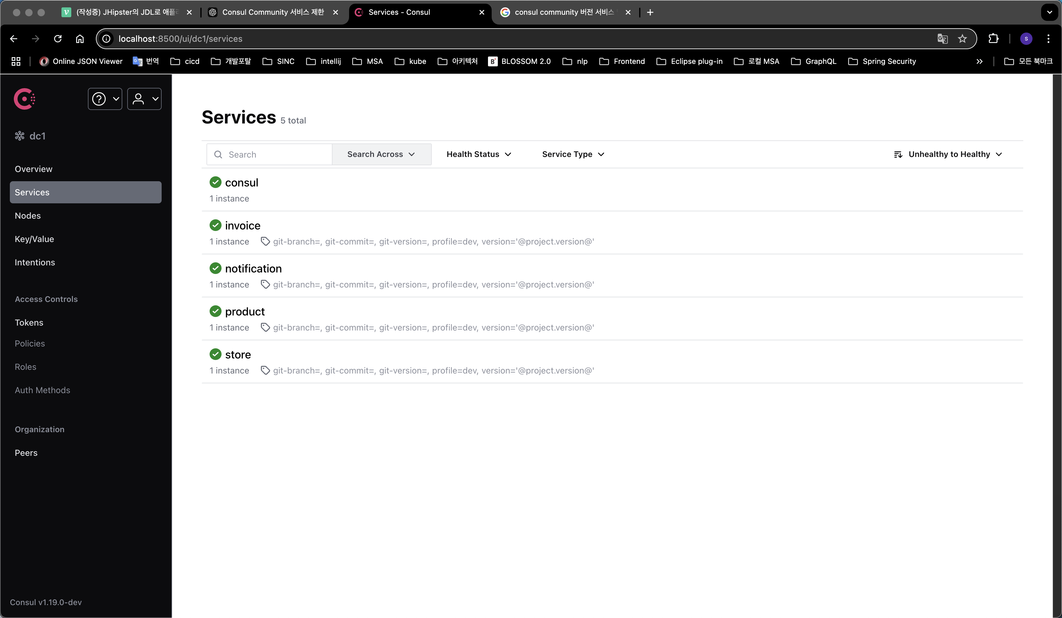 consul ui에서 서비스 연결 상태를 확인해 보면 4개의 서비스와 consul agent가 정상적으로 실행 되고 있는것을 확인 할 수 있었습니다.