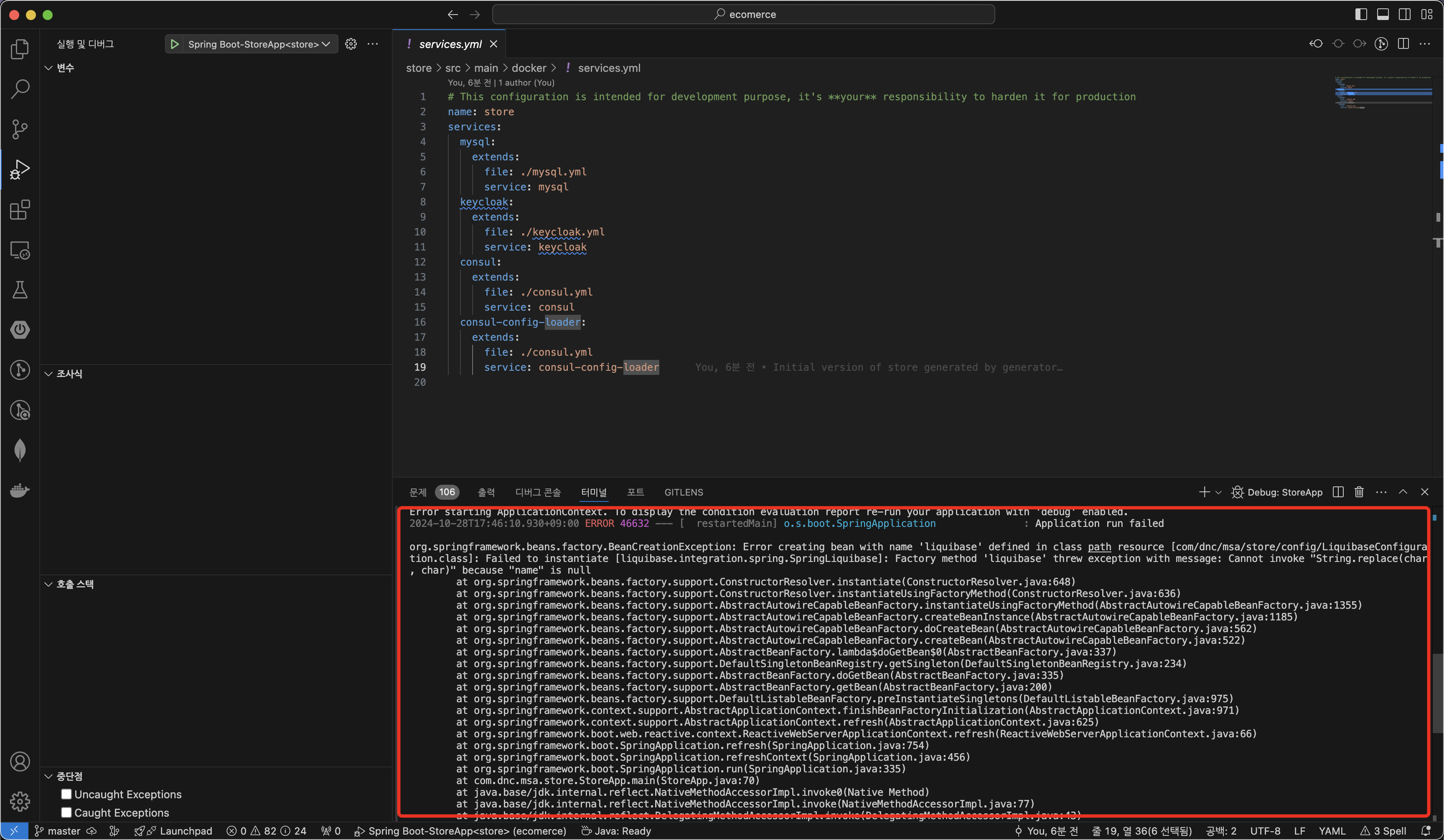 역시나 지난번 reactive-mf.yml 파일로 생성했을때와 동일하게 liquibase 설정 클래스에서 에러가 나네요.