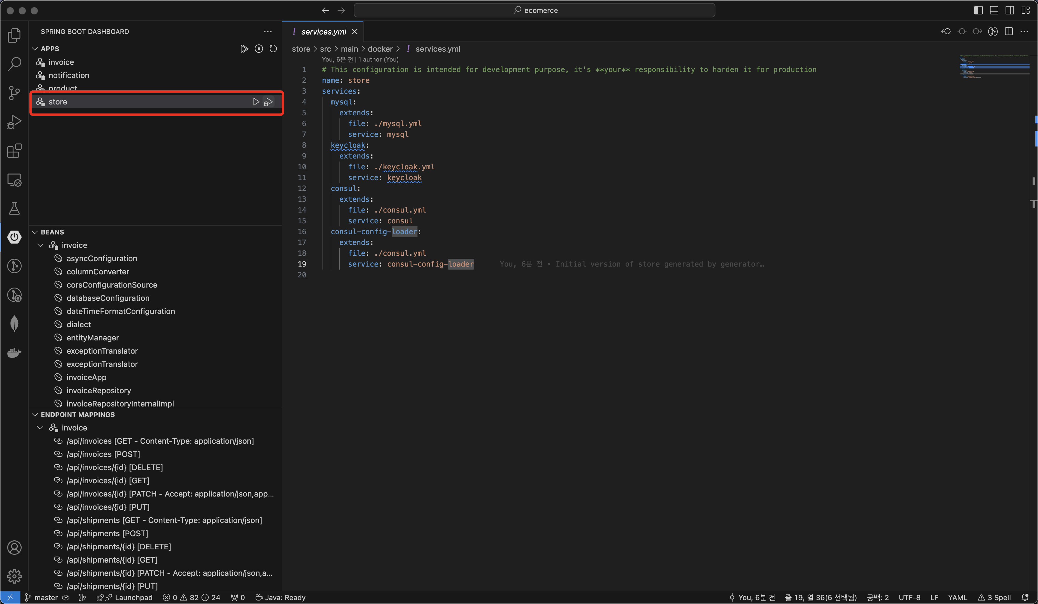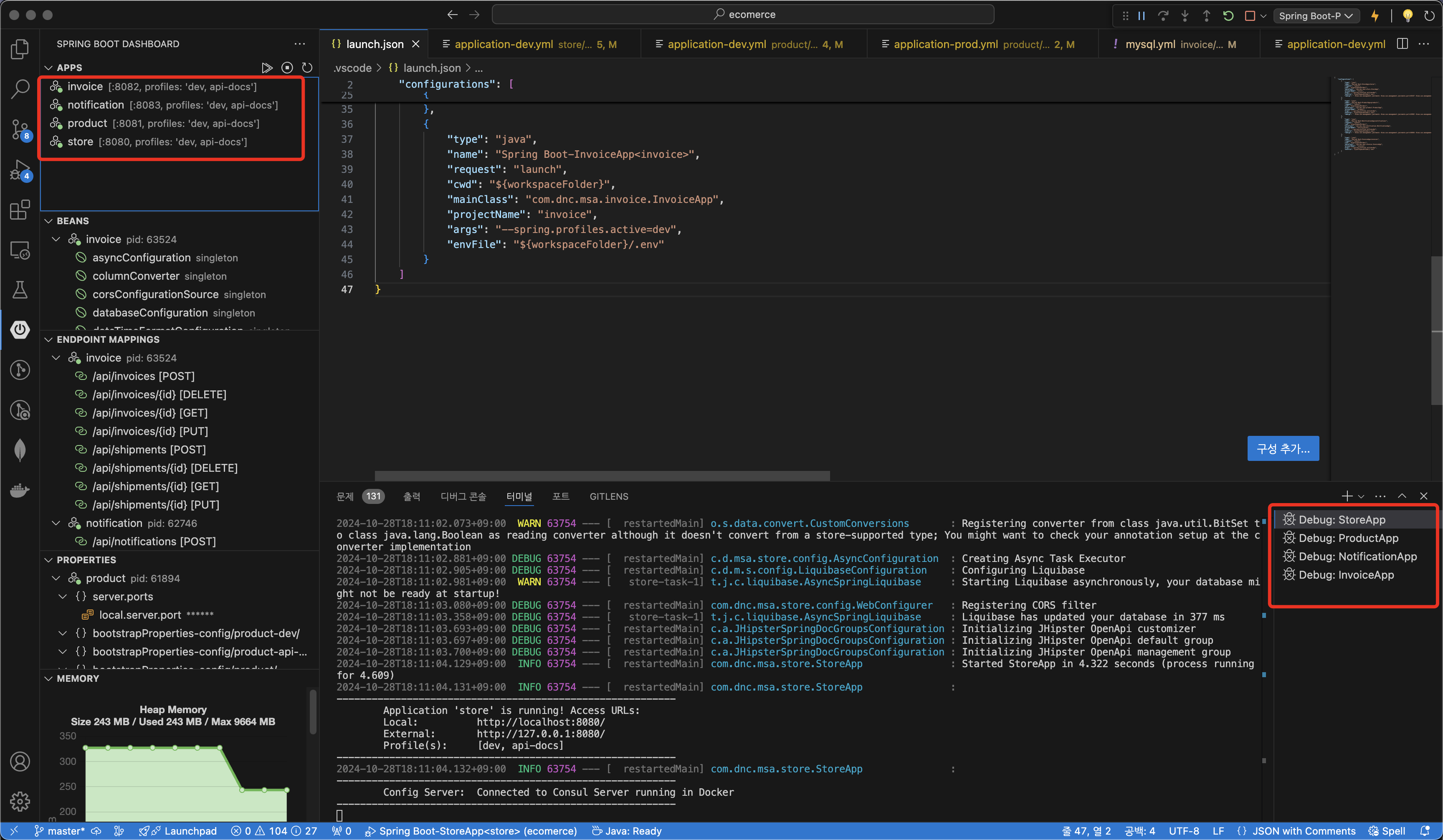 총 4개(store, invoice, notification, product) 애플리케이션으로 구성되어 있으며, 이중 store가 gateway 서비스이며, 나머지는 마이크로 서비스 애플리케이션입니다.