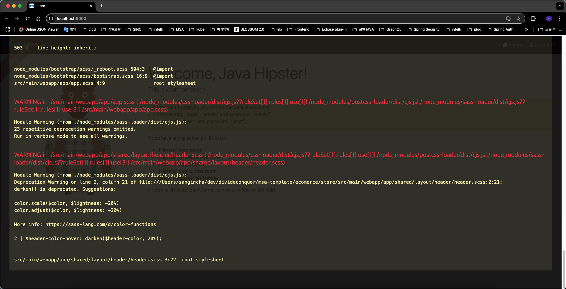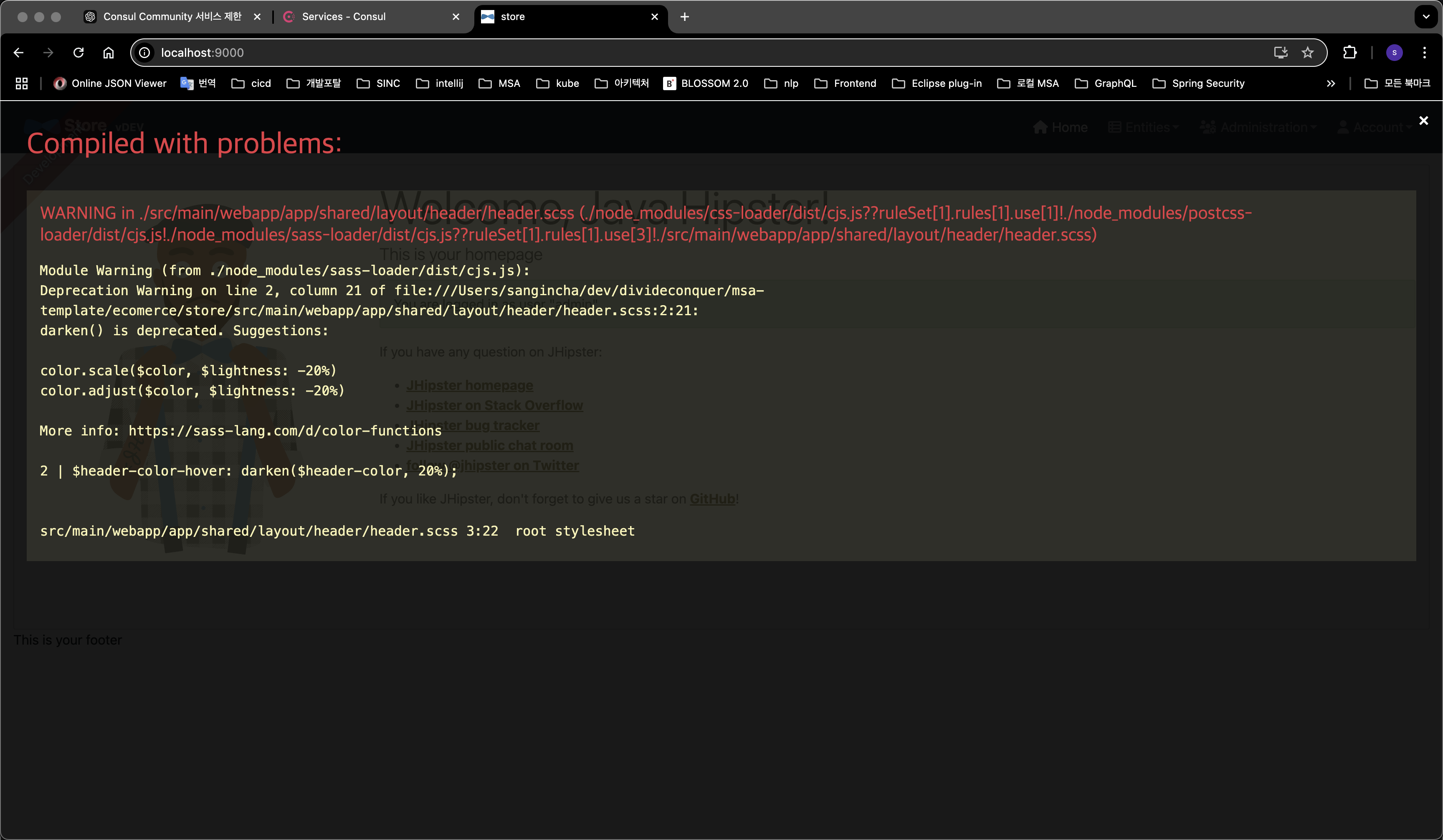 정상적으로 애플리케이션이 실행되지 않았습니다. scss에서 deprecated된 function을 사용하는 모냥입니다.