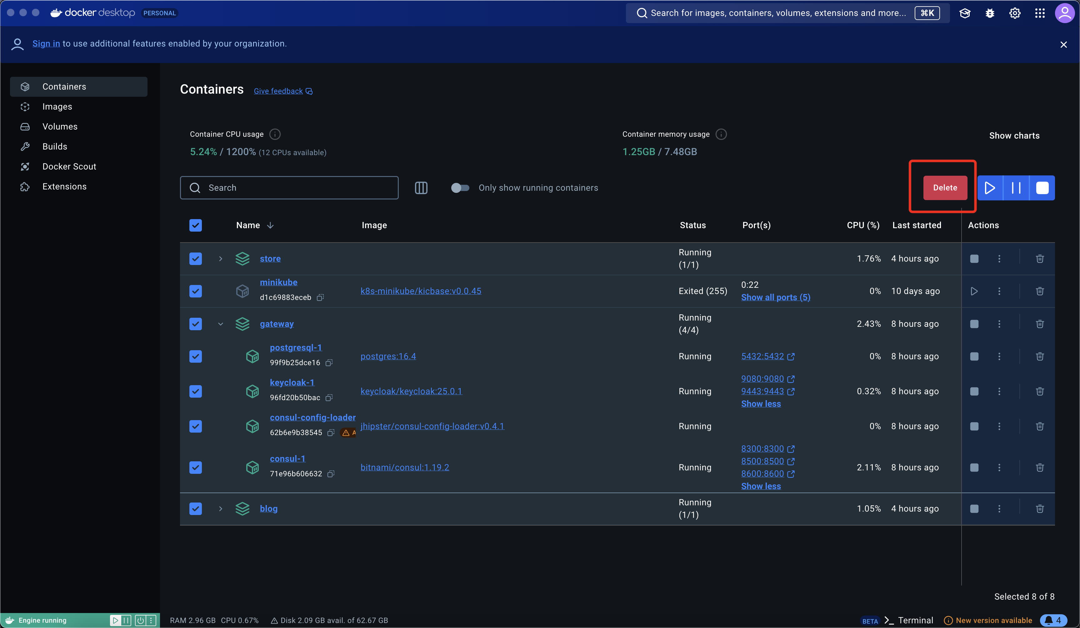 실행 전 이전 작업하면서 생성되었던 도커 컨테이너들을 모두 삭제합니다.