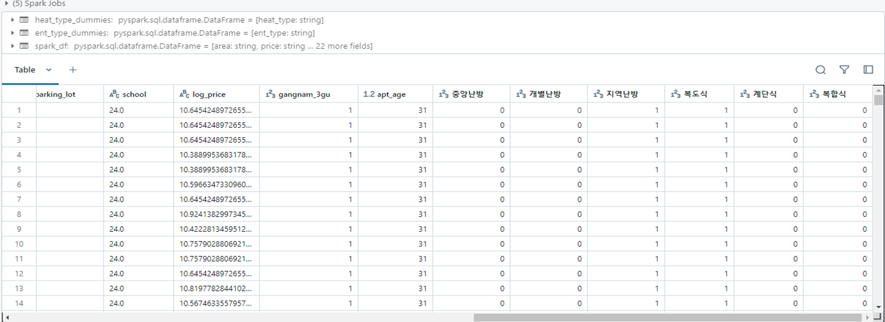 spark_df = spark_df.drop('gu', 'dong', 'apt_name', 'trans_year', 'trans_month', 'trans_day', 'street_address', 'com_year')