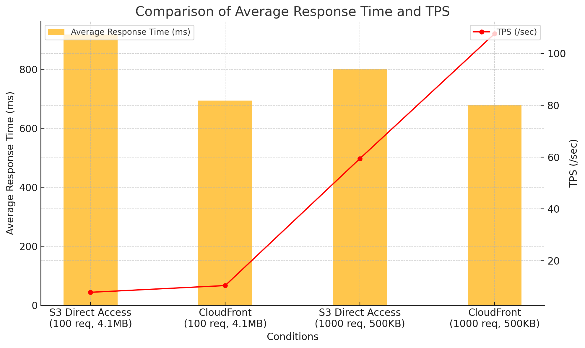 - 파일 크기에 관계없이 CloudFront는 S3에 직접 접근하는 것 대비 더 빠른 응답 시간과 높은 TPS를 제공하였다. 이는 엣지 서버 캐싱 및 효율적인 네트워크 처리가 주된 이유라고 판단된다.