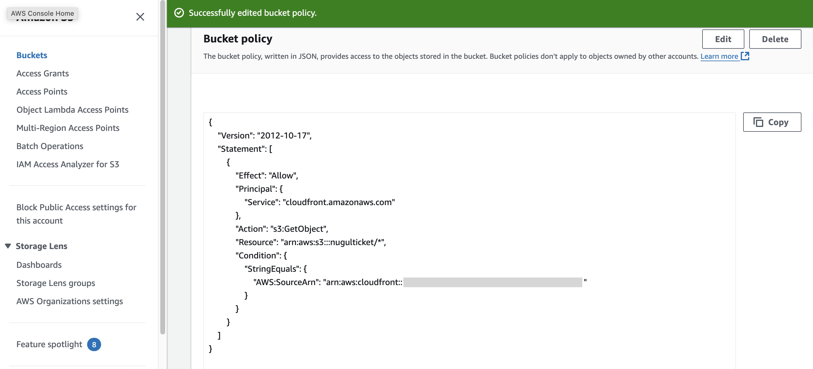 - S3에서 버킷 정책에 CloudFront 전용으로 제한하는 정책으로 변경