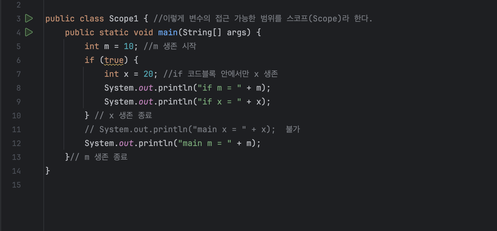 변수는 꼭 필요한 범위로 한정해서 사용하는 것이 좋다. 변수의 스코프는 꼭 필요한 곳으로 한정해서 사용하자. 메모리를 효율적으로 사용하고 더 유지보수하기 좋은 코드를 만들 수 있다.