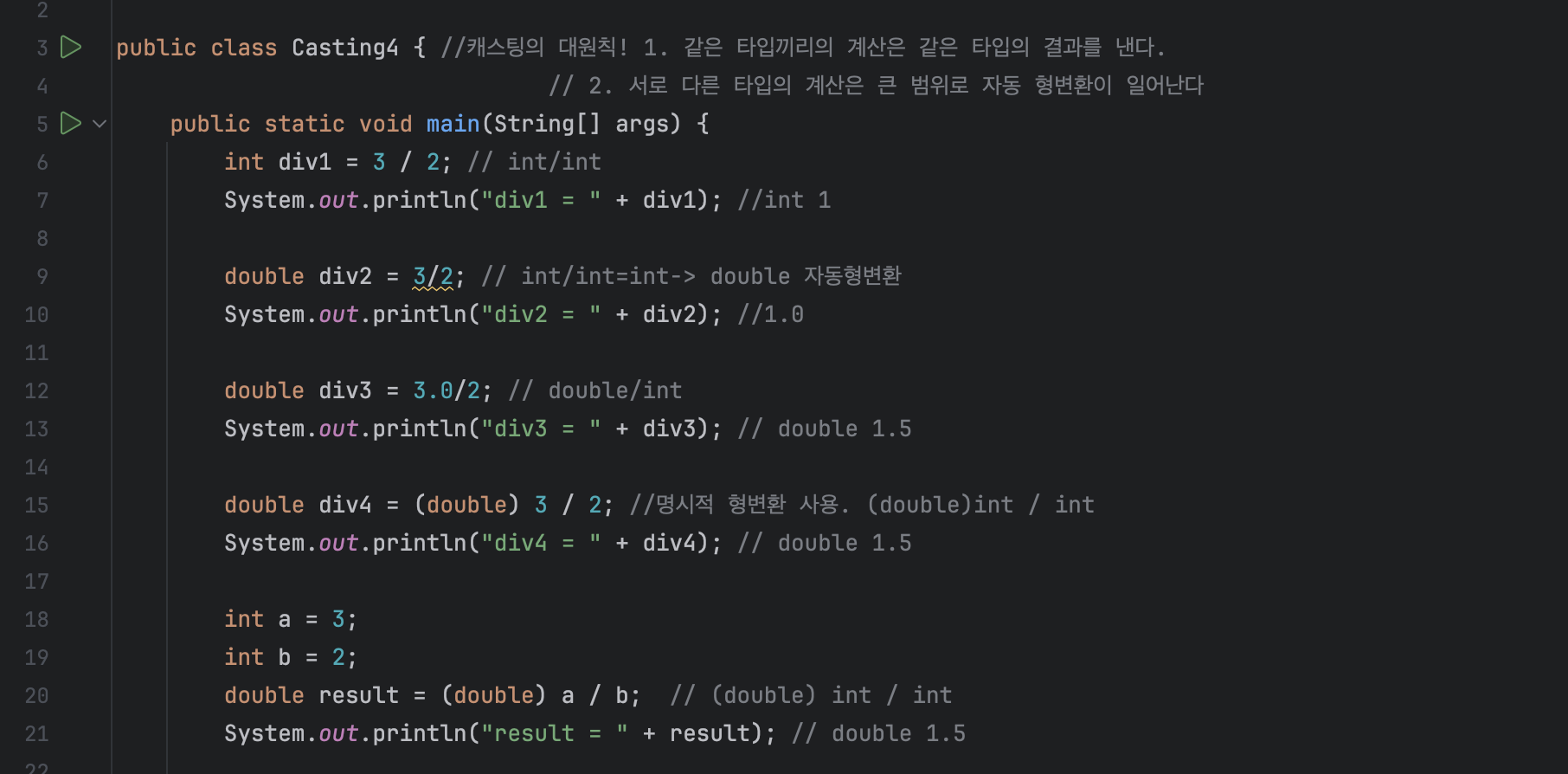 doubleValue 자체의 타입이 변경되거나 그 안에 있는 값이 변경되는 것은 아니다.doubleValue 에서 읽은 값을 형변환 하는 것이다. doubleValue 안에 들어있는 값은 1.5 로 그대로 유지된다. 참 고로 변수의 값은 대입연산자( = )를 사용해서 직접 대입할 때만 변경된다.int + int 는 int 를, double + double 은 double 의 결과가 나온다. int + long 은 long + long 으로 자동 형변환이 일어난다.