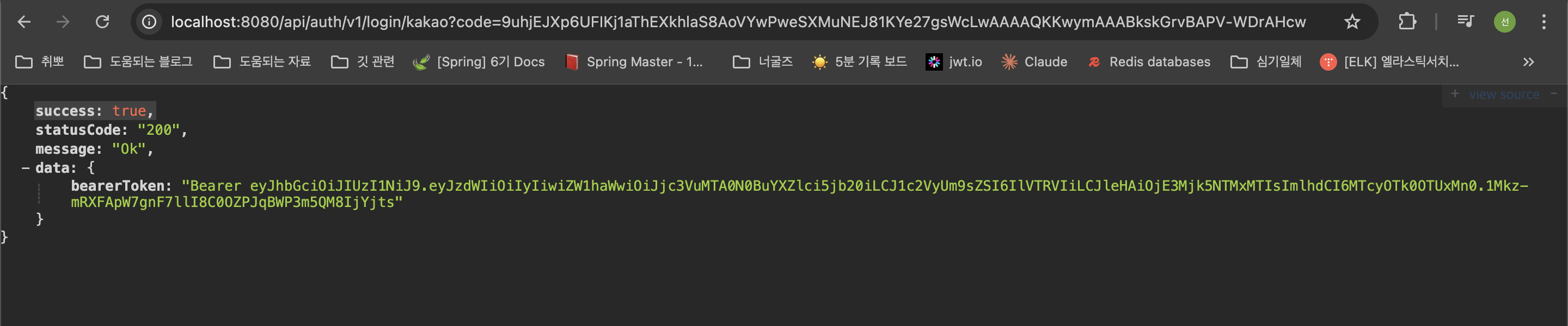 그렇게 로그인을 하게 되면 바로 해당 페이지에 jwt Token이 표시되게 구현했다.(이래도 되나 싶었지만 우리는 프론트가 없으니 우선..)