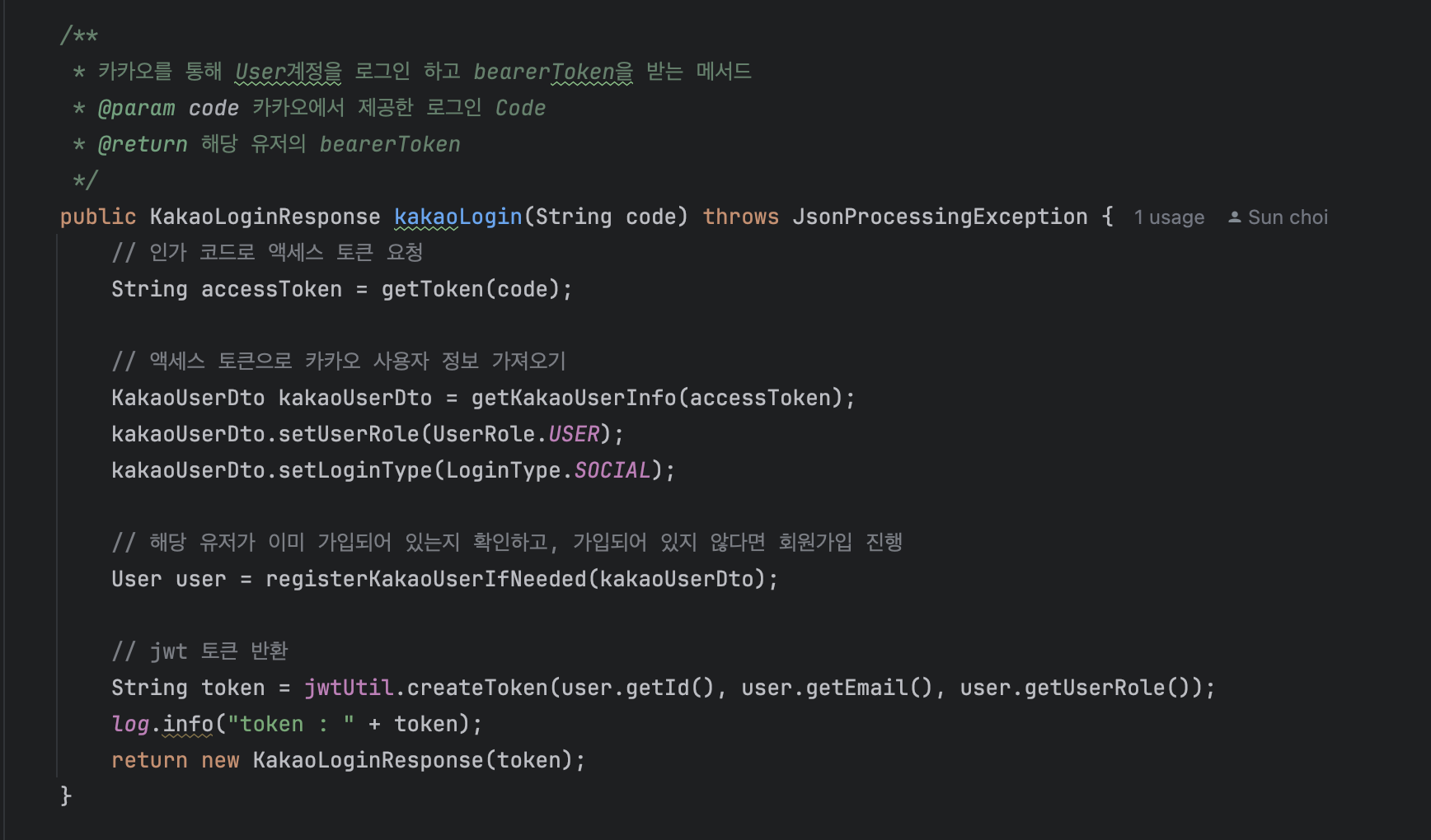 위 코드에서 필요한 getToken, getKakaoUserInfo, registerKakaoUserIfNeeded 이 3개의 메서드를 만들어준다.