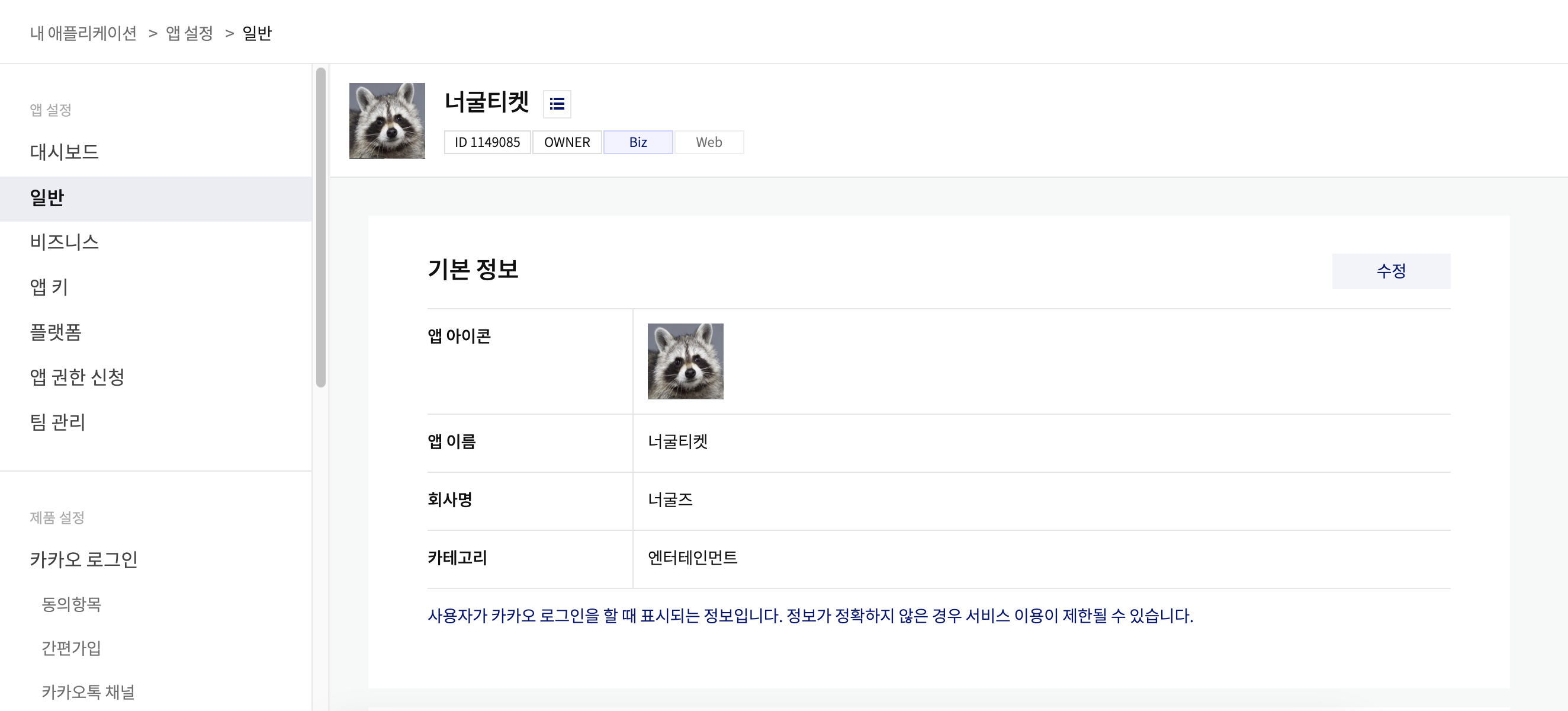 앱 설정 - 일반 에서 만들어준 애플리케이션을 확인할 수 있다.