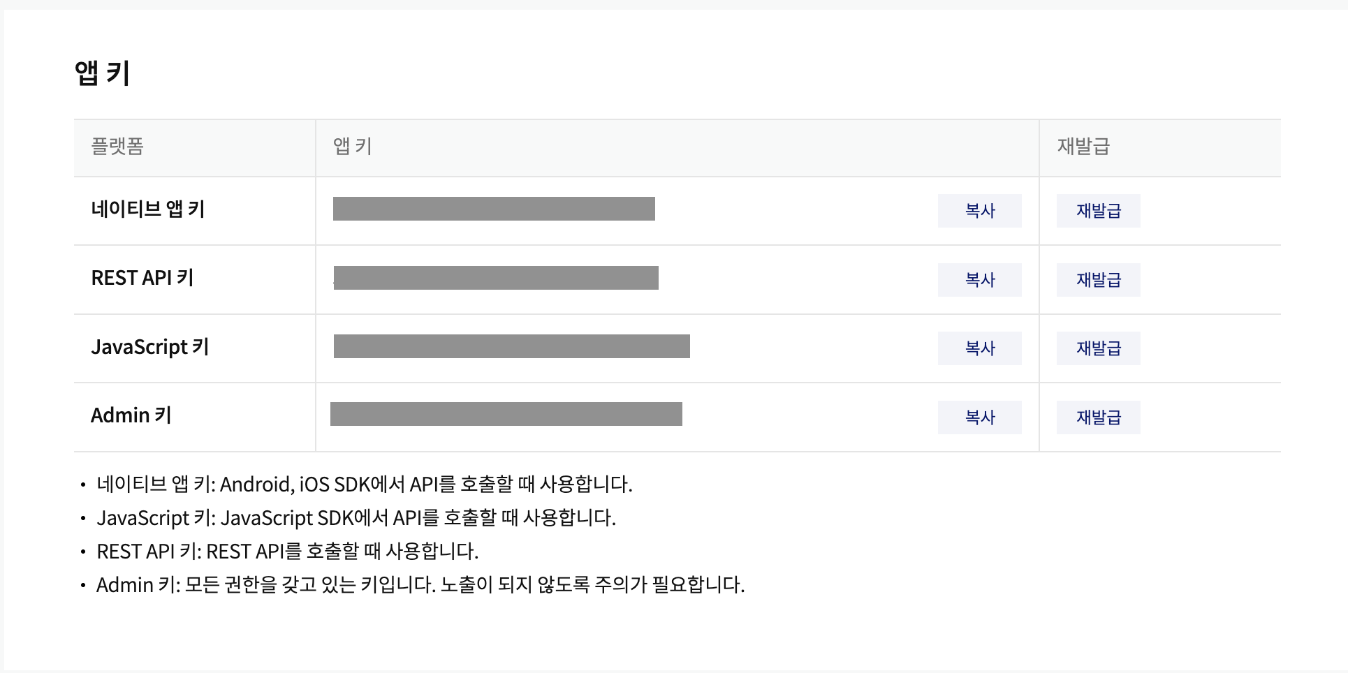 바로 밑 탭에서 앱 키를 볼 수 있는데, 나는 이 중 REST API 키만 사용한다.
