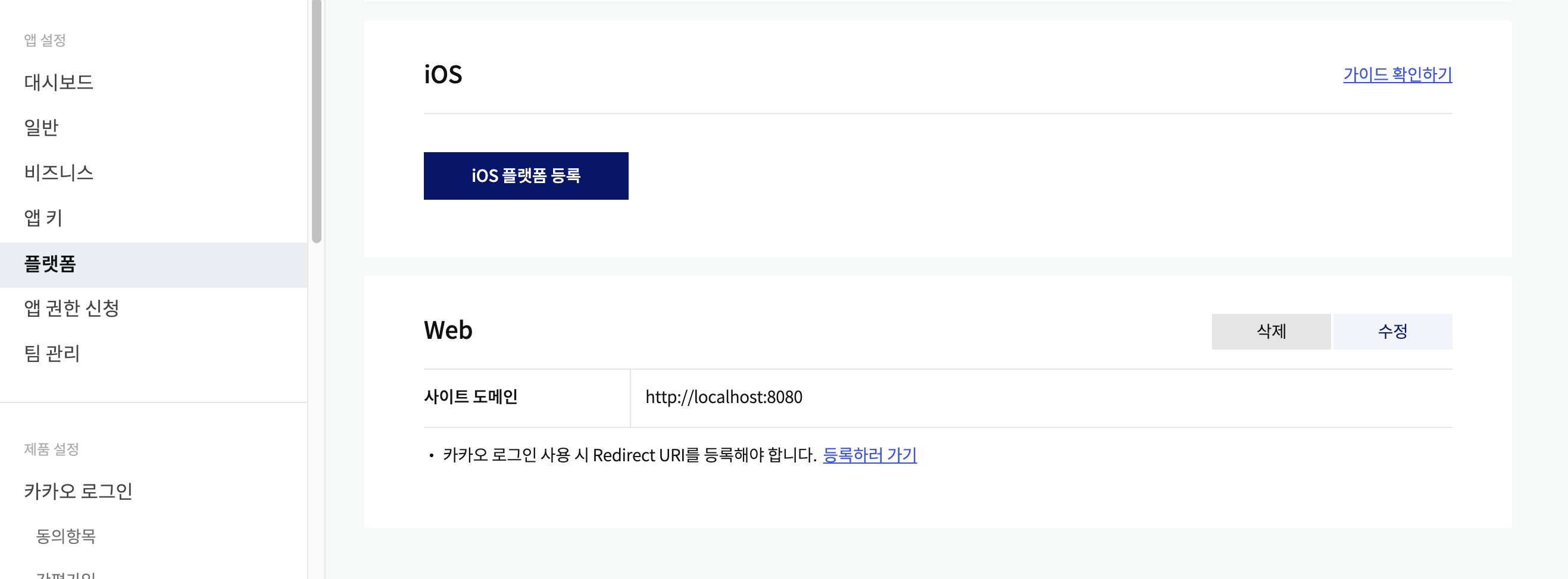 사이트 도메인 등록을 해야하는데, 나는 일단 localhost:8080으로 등록했고,