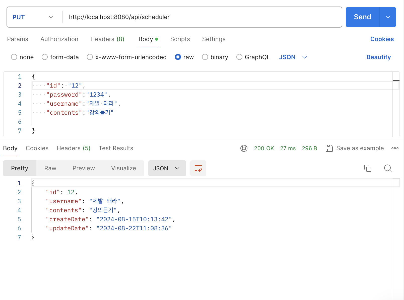 그래서 처음엔 단순히 이렇게 @RequestBody로 변경하고 Postman으로 찍어봤는데