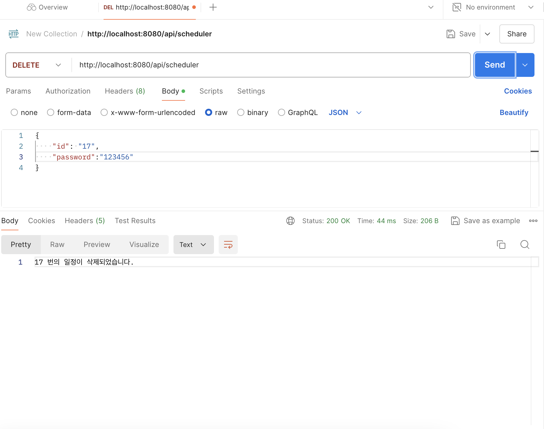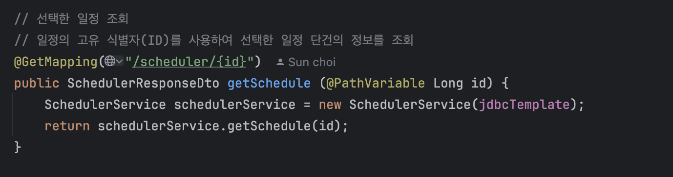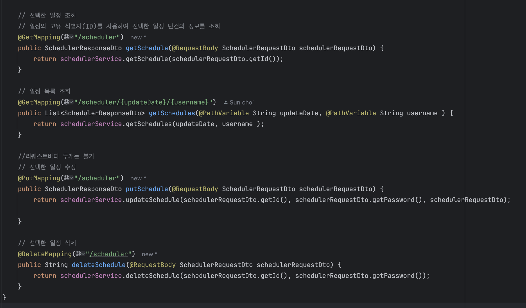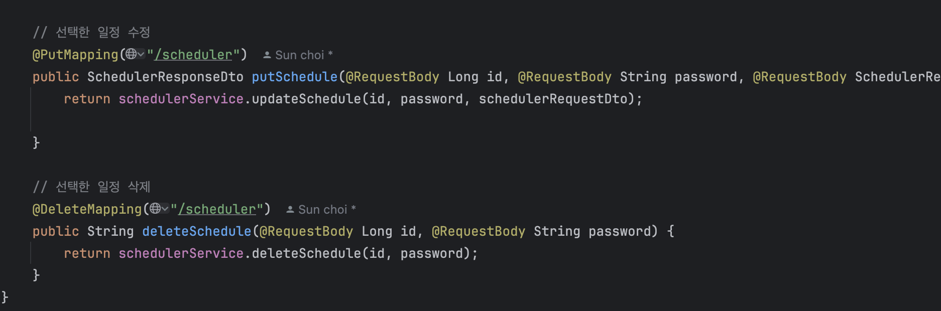 선택한 일정 조회, 일정 수정, 삭제 시 id와 password를 받는데 그 때 PathVariable 방식을 썼던 걸 문제점을 파악하고 RequestBody로 변경해 바디값 안에 넣어주려고 했다.
