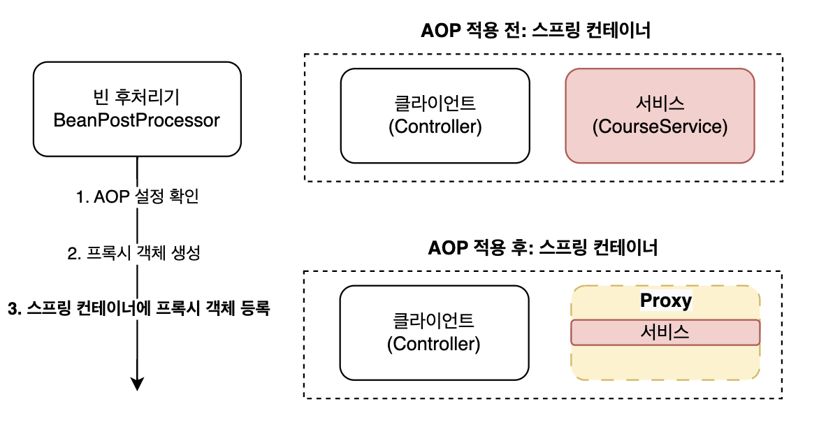 1 AOP는 기본적으로 프록시 기반으로 동작하여 실제 객체가 아닌 해당 객체의 프록시가 대신 메소드를 호출한다. 프록시 객체를 사용하지 않으면 AOP가 적용되지 않는다.