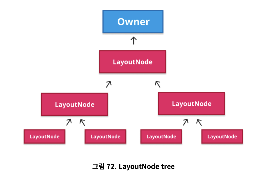 - Composable들은 일반적으로 서로 다른 라이브러리(foundation, material)에 속하지만, 결국 모두 Layout(compose‐ui)으로 정의되므로 같은 노드 타입, LayoutNode를 방출