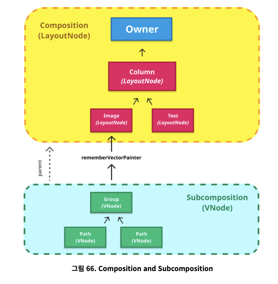 - 예시) Vector가 Subcomposition으로 모델링되는 이유 -> 부모 Composition에서 사용 가능한 CompositionLocal 중 일부에 접근하기 용이함(테마, 밀도 등)