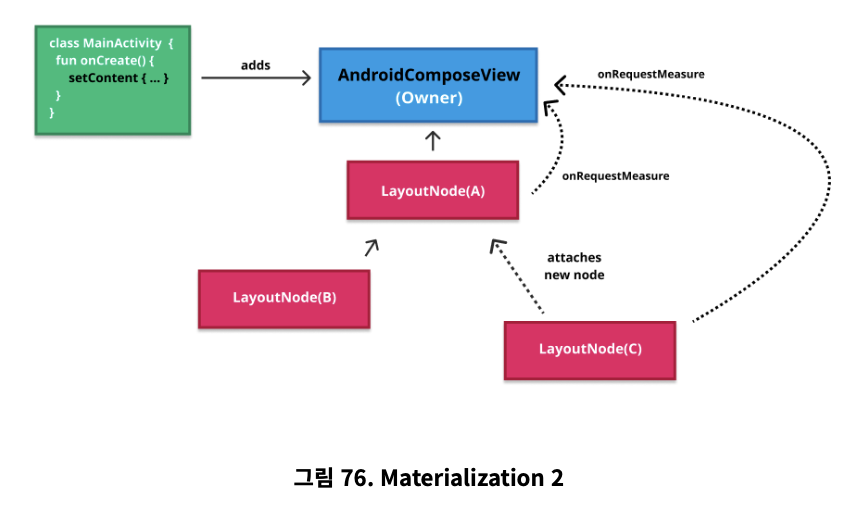 - 노드가 추가되는 상황에서, 부모와 자신에 대한 재측정을 요청 to AndroidComposeView(as owner)