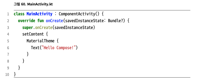 - setContent 함수는 새로운 루트 Composition을 생성 (Activity, Fragment, View)