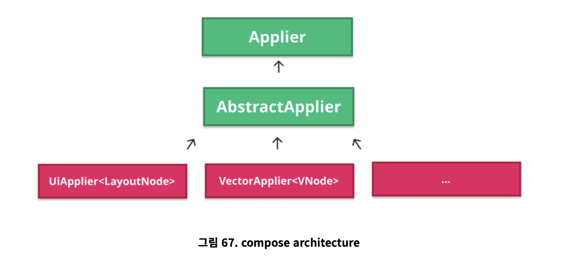 • UiApplier: 대부분의 안드로이드 UI를 렌더링하는데 사용, 노드 타입을 LayoutNode로 고정, 트리의 모든 Layout을 구체화 함.