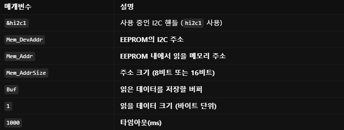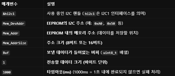 📌 EEPROM 쓰기는 내부적으로 시간이 걸리므로, HAL_Delay(10) 같은 딜레이 필수.