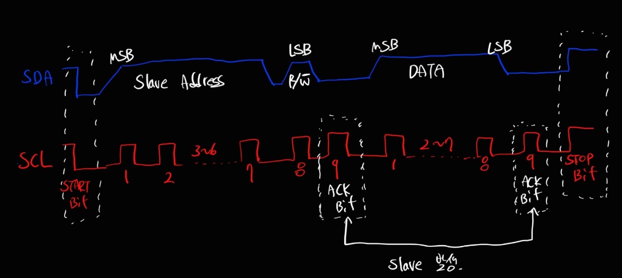 SDA의 첫 1Byte는 Slave address인데, 이를 통해 1개의 SDA 신호 선에 다른 주소의 여러 부품들을 연결할 수 있다.