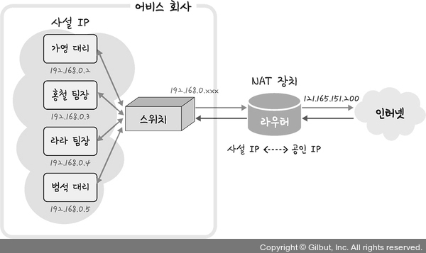 공인 IP 주소 하나를 공유하여 외부와 통신할 수 있도록 함패킷의 IP 주소 정보를 수정하여 IP 주소를 다른 주소로 매핑