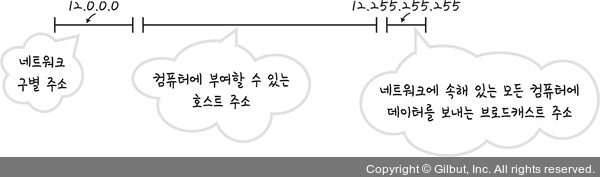 네트워크 주소(사용 불가)사용 가능한 주소브로드 캐스트용 주소 → 네트워크에 속한 모든 컴퓨터에 데이터 보낼 때 사용(사용 불가)A 클래스로 12.0.0.0 네트워크를 부여받았다면,