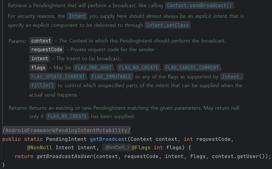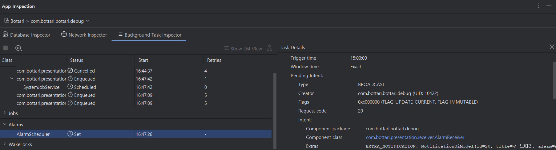 위의 알람 탭을 클릭하면 해당 PendingIntent