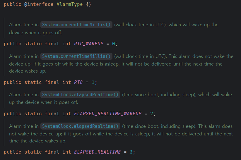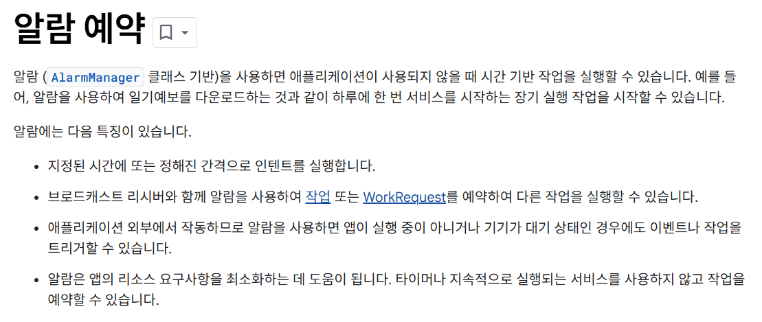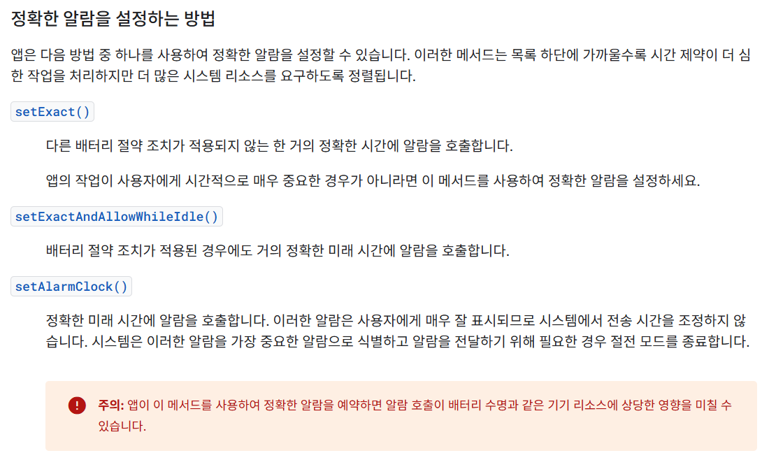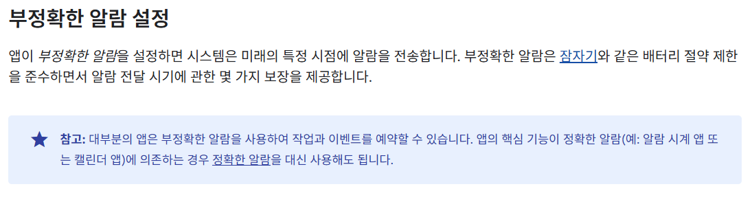 하지만 문서에 나와 있듯이 정확한 알람 예약은 리소스에 영향을 미칠 수 있기 때문에,