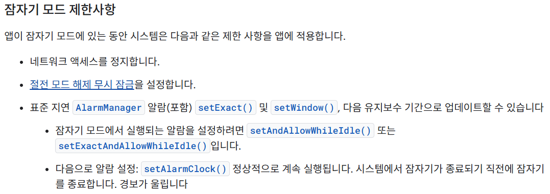 OS 레벨에서 배터리 관리를 위해 정확한 알람을 보장하지 않게 됩니다.
