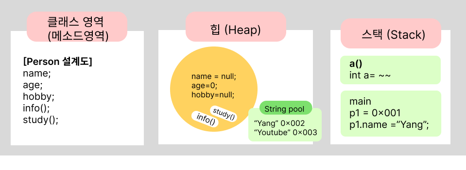 문자열은 무조건 힙 영역 내 문자열 풀에 따로 있고, 문자열 변수에 값을 입력하면 그 문자열 풀에 해당 문자열의 참조값을 가져와서 저장함.