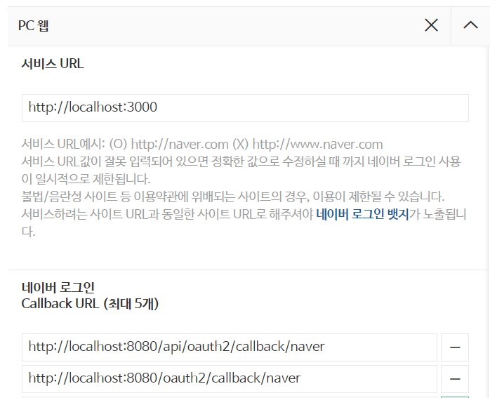 CallBack URL을 좀 더 쉽게 설명하자면, 서비스 URL을 통해서 네이버 로그인을 하고, 추후에 받는 정보들을 위한 URL을 입력해주면 된다.