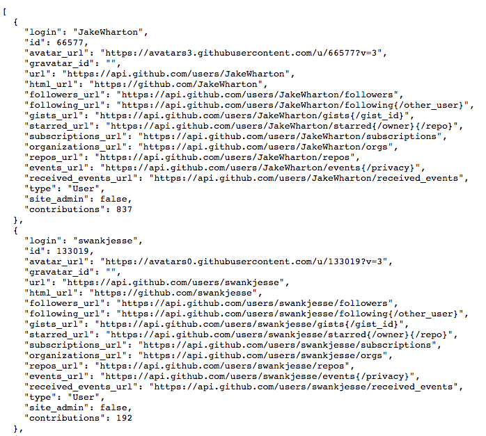 https://api.github.com/repos/square/retrofit/contributors 에 들어가면 아래와 같이 JSON 형식으로 된 정보들이 나온다.