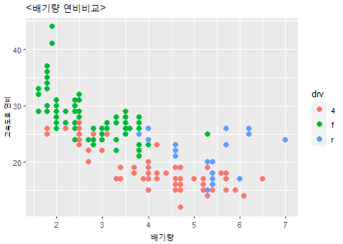 > g + labs(title="<배기량 연비비교>", x="배기량", y="고속도로 연비")