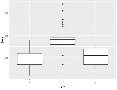 ggplot(mpg, aes(drv, hwy)) + geom_boxplot()