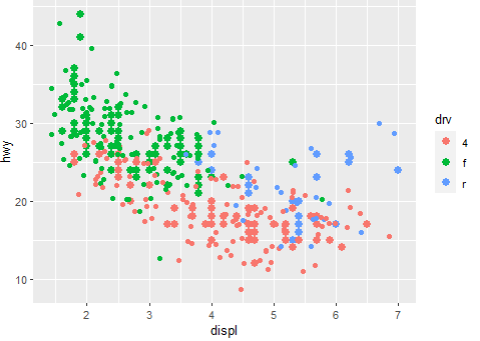 > g <- ggplot(mpg, aes(x=displ, y=hwy, color = drv)) +