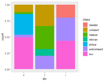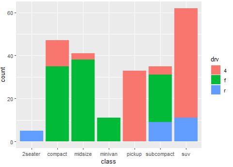 > ggplot(mpg, aes(x=class, fill=drv)) + geom_bar()