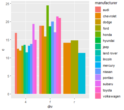 ggplot(aes(x=drv, y=c, fill=manufacturer)) +