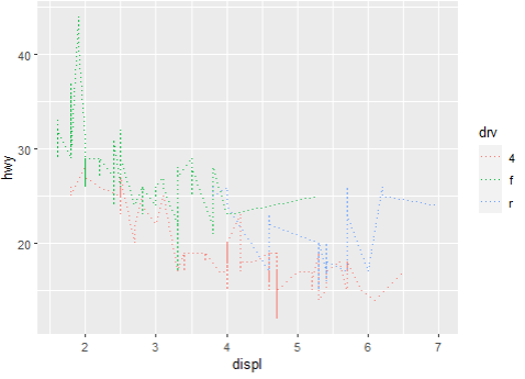> ggplot(mpg, aes(x=displ, y=hwy, color = drv)) + geom_line(linetype = 3)