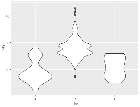 ggplot(mpg, aes(drv, hwy)) + geom_violin()