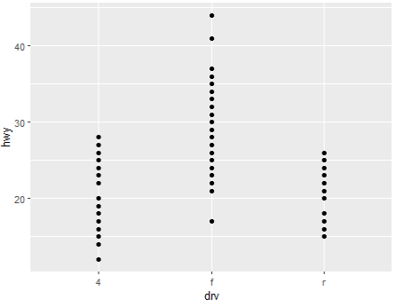 ggplot(mpg, aes(drv, hwy)) + geom_point()