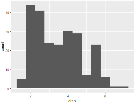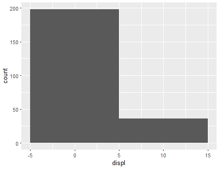 ggplot(mpg, aes(x=displ)) + geom_histogram(binwidth = 10)