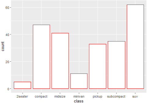 > ggplot(mpg, aes(x=class))+ geom_bar(color="red", fill="white")