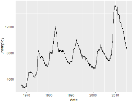 > ggplot(economics, aes(date, unemploy)) + geom_line()