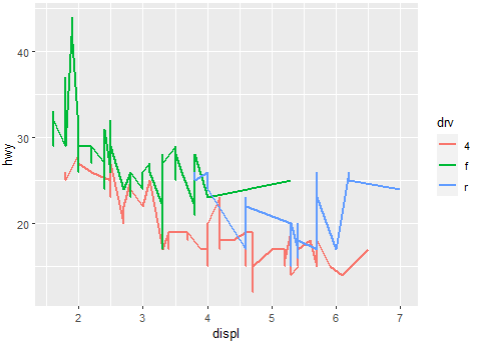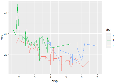 > g <- ggplot(mpg, aes(x=displ, y=hwy, color = drv)) + geom_line()