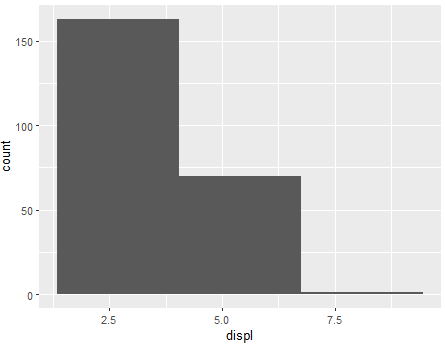 ggplot(mpg, aes(x=displ)) + geom_histogram(bins=3)