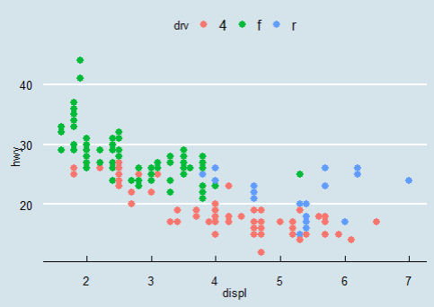 > g <- ggplot(mpg, aes(x=displ, y=hwy, color = drv)) + geom_point(size = 3)